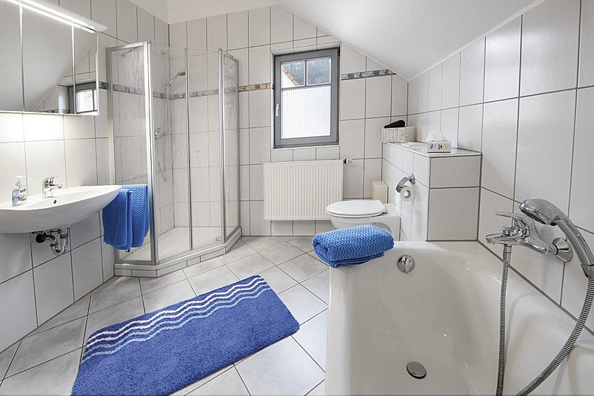 Das Badezimmer verfügt über eine Badewanne, eine Dusche, sowie ein WC und ein großes Waschbecken.